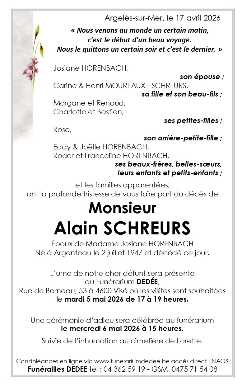 Funérarium DEDEE de Visé le mercredi 6 mai à 15 heures