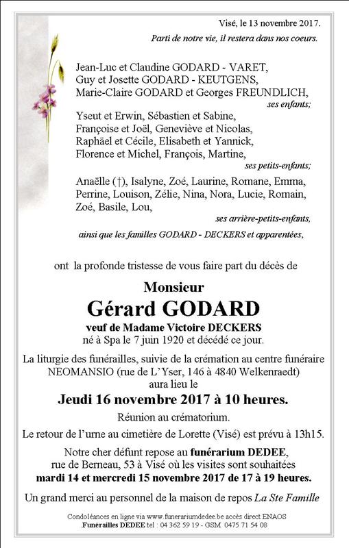 Décédé à Thimister (4890) le lundi 13 novembre 2017 à l'âge de 97 ans