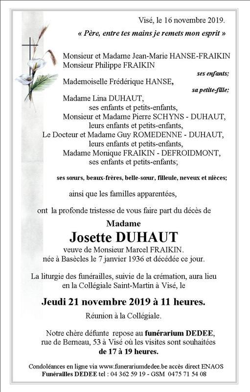 Décédée à Blegny (4670) le samedi 16 novembre 2019 à l'âge de 83 ans