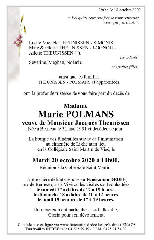 Décédée à Herstal (4040) le vendredi 16 octobre 2020 à l'âge de 89 ans