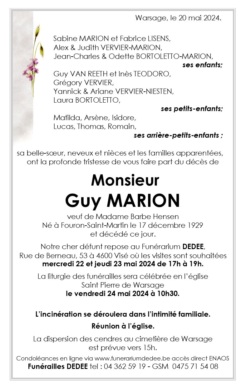 Décédé à Plombières (4850) le lundi 20 mai 2024 à l'âge de 94 ans