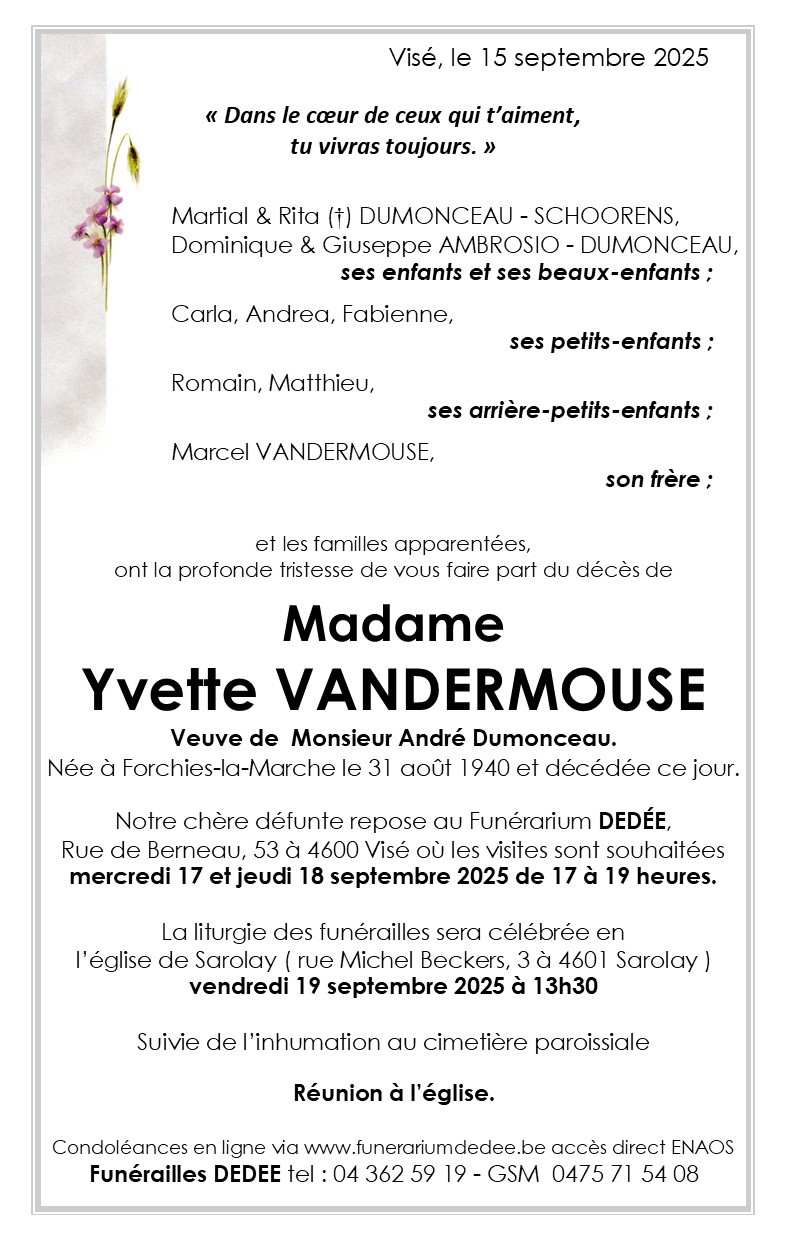 Décédée à Visé (4600) le lundi 15 septembre 2025 à l'âge de 85 ans