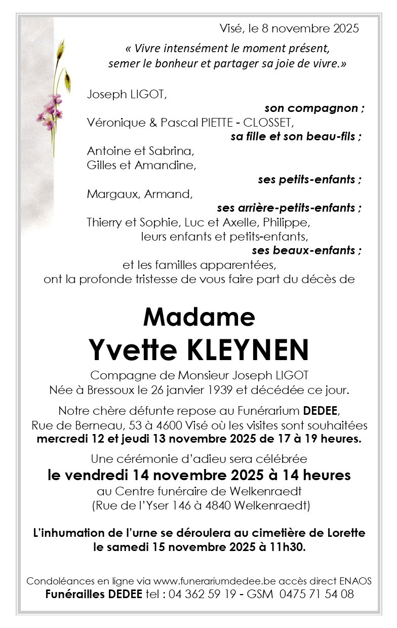 Décédée à Herstal (4040) le samedi 8 novembre 2025 à l'âge de 86 ans