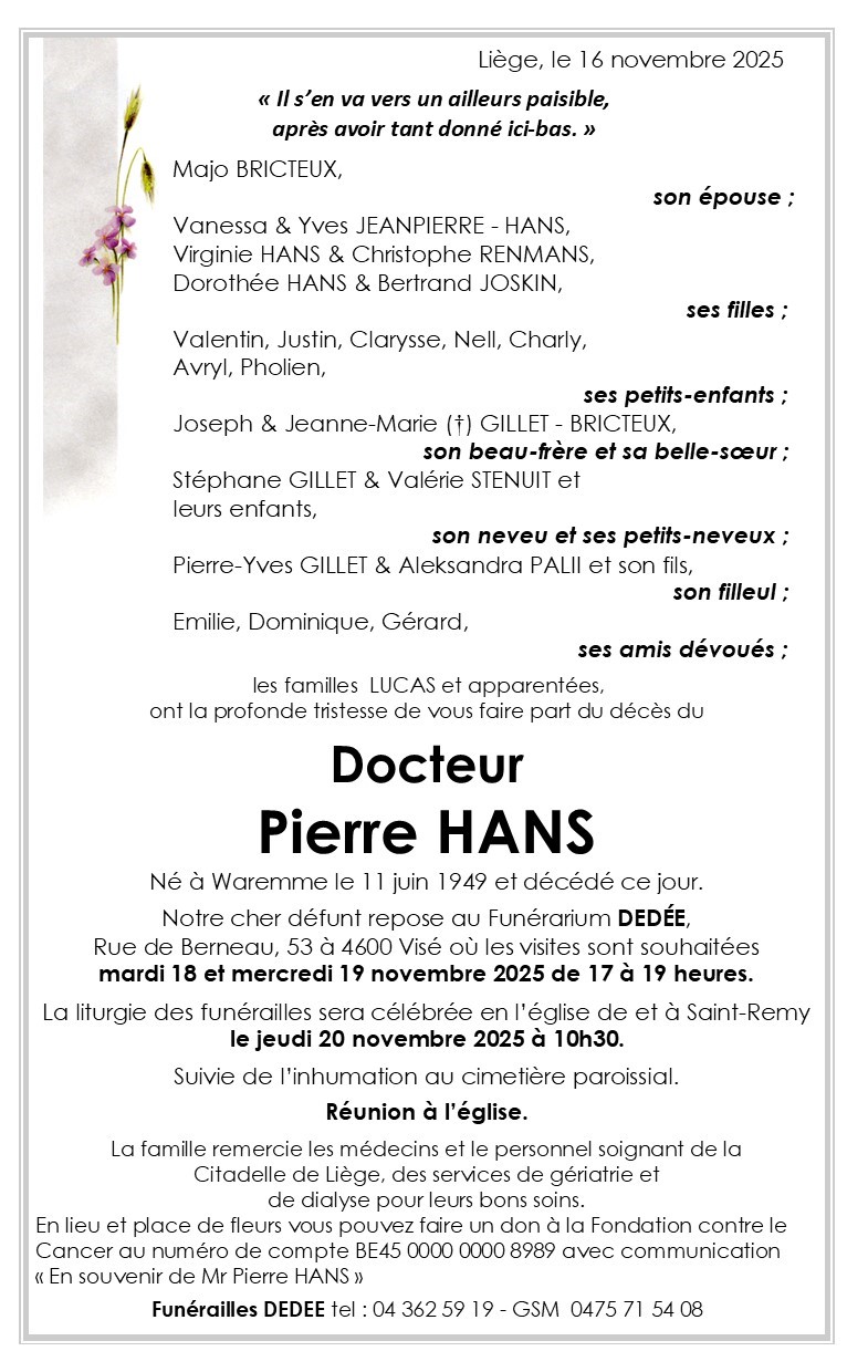 Décédé à Liège (4000) le dimanche 16 novembre 2025 à l'âge de 76 ans