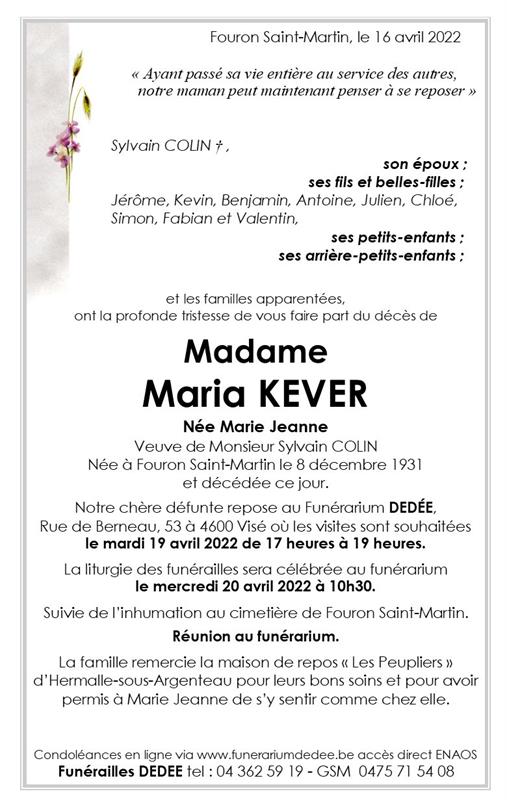 Née à Fouron-Saint-Martin (3790) le mardi 8 décembre 1931