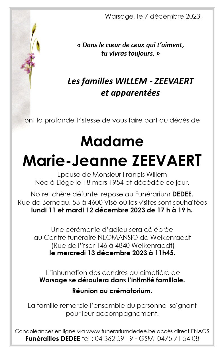 Décédée à Hermalle-sous-Argenteau (4681) le jeudi 7 décembre 2023 à l'âge de 69 ans