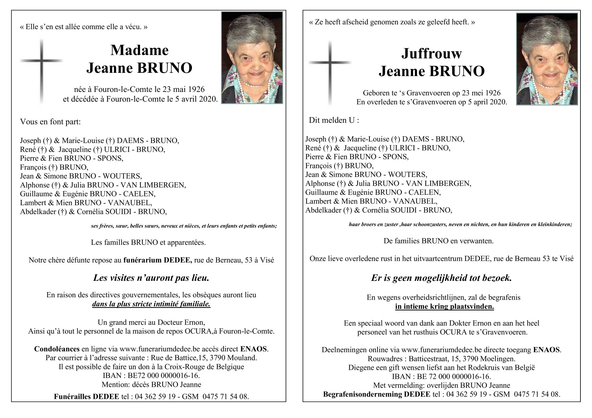 Décédée à Fouron-le-Comte (3798) le dimanche 5 avril 2020 à l'âge de 93 ans