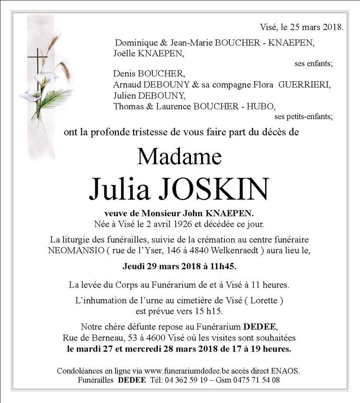 Décédée à Visé (4600) le dimanche 25 mars 2018 à l'âge de 91 ans