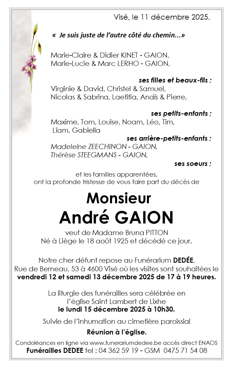 Décédé à Hermalle-sous-Argenteau (4681) le jeudi 11 décembre 2025 à l'âge de 100 ans