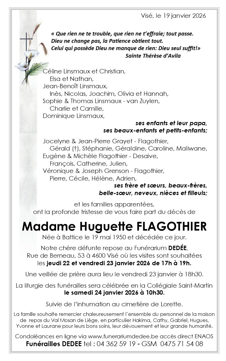 Décédée à Liège (4000) le lundi 19 janvier 2026 à l'âge de 75 ans