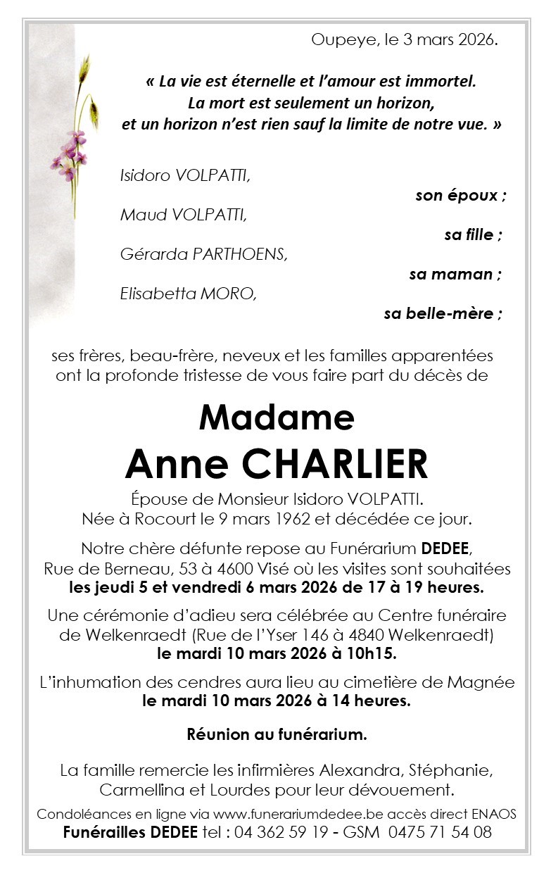 Décédée à Oupeye (4683) le mardi 3 mars 2026 à l'âge de 63 ans