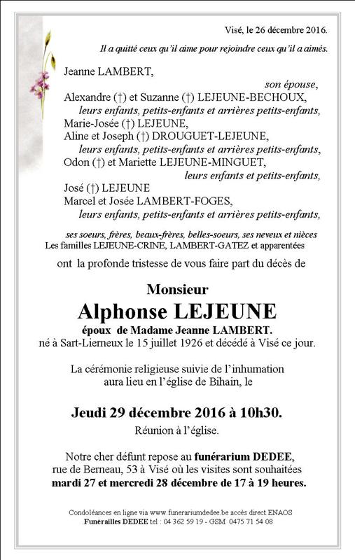 Décédé à Visé (4600) le lundi 26 décembre 2016 à l'âge de 90 ans