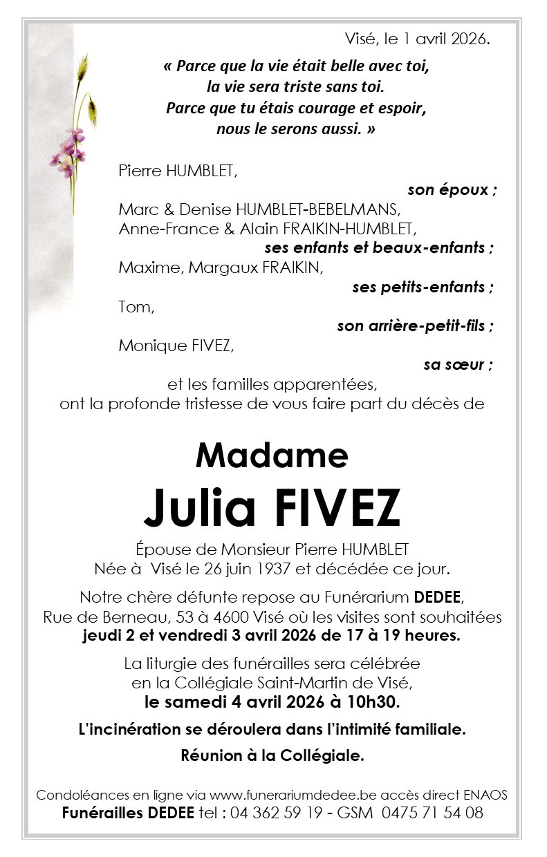 Décédée à Hermalle-sous-Argenteau (4681) le mercredi 1 avril 2026 à l'âge de 88 ans