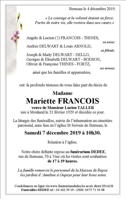 Décédée à Oupeye (4680) le mercredi 4 décembre 2019 à l'âge de 90 ans