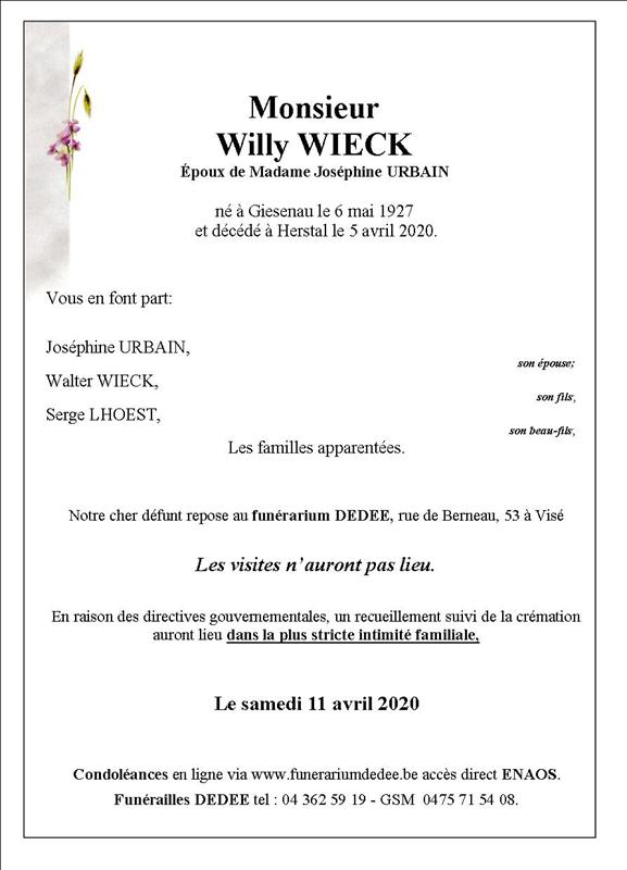 Décédé à Herstal (4040) le dimanche 5 avril 2020 à l'âge de 92 ans