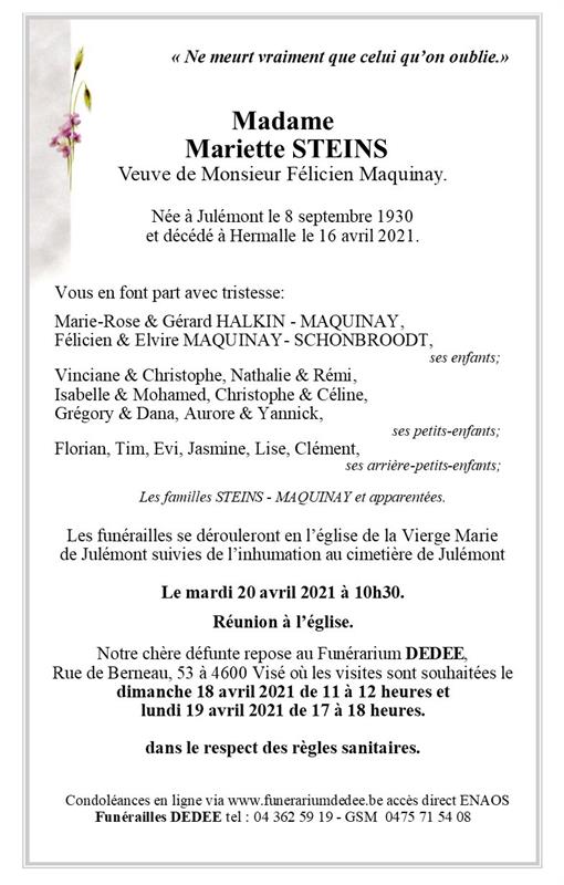 Décédé à Hermalle-sous-Argenteau (4681) le vendredi 16 avril 2021 à l'âge de 90 ans