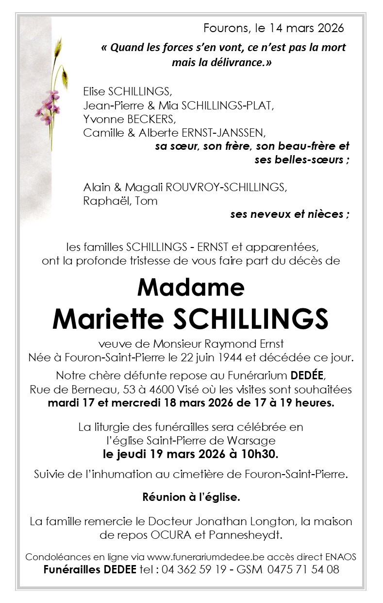 Décédée à Montzen (4850) le samedi 14 mars 2026 à l'âge de 81 ans