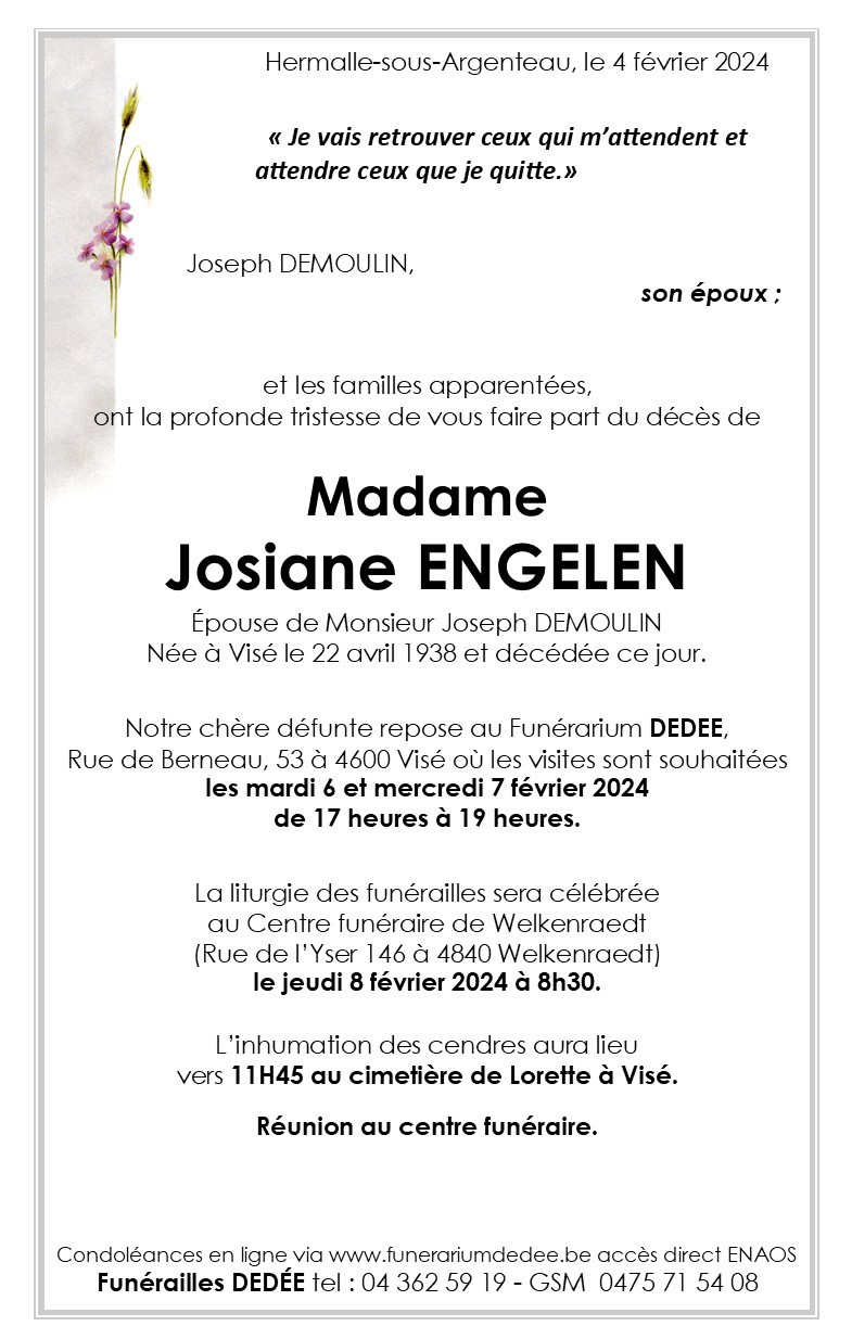 Décédée à Hermalle-sous-Argenteau (4681) le dimanche 4 février 2024 à l'âge de 85 ans