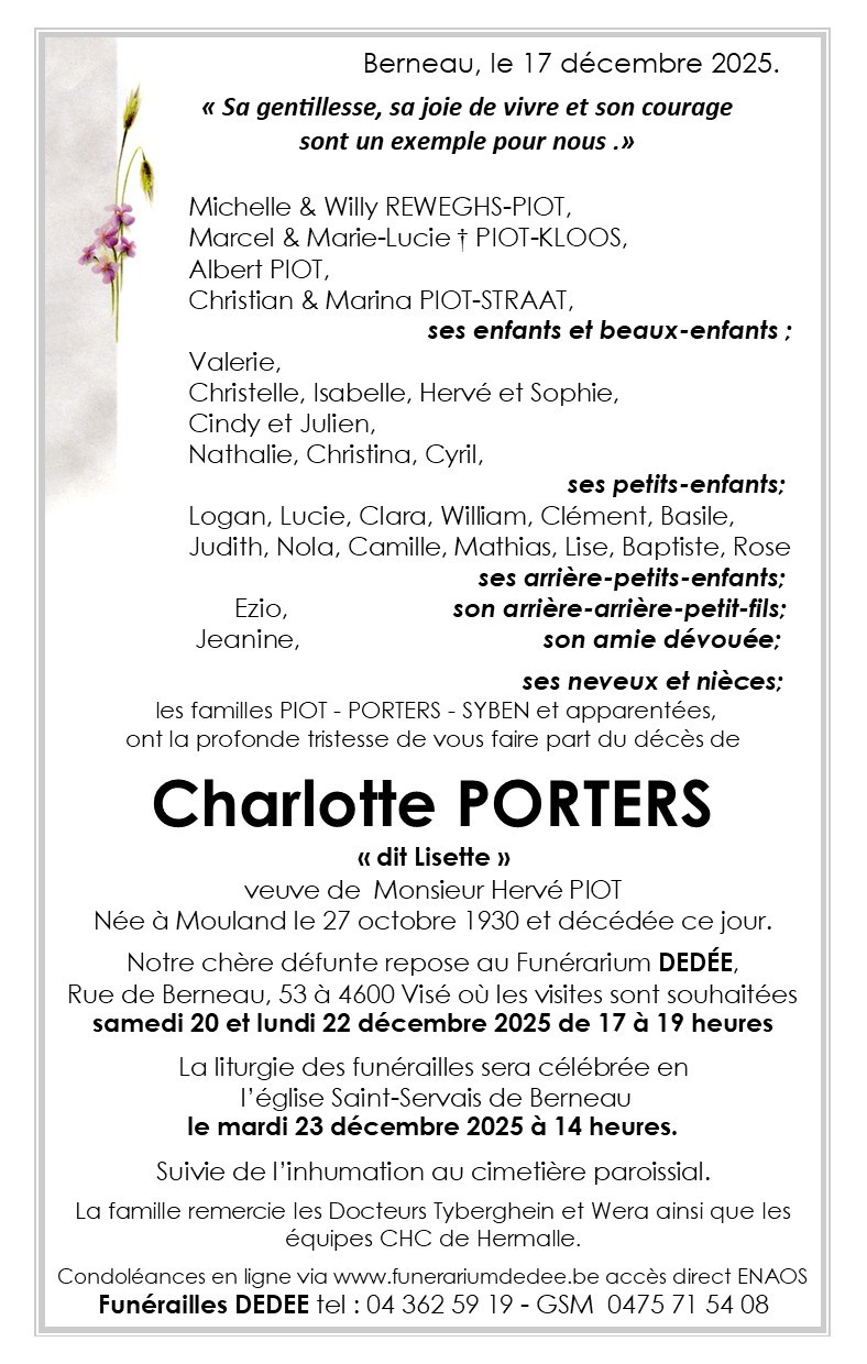 Décédée à Hermalle-sous-Argenteau (4681) le mercredi 17 décembre 2025 à l'âge de 95 ans