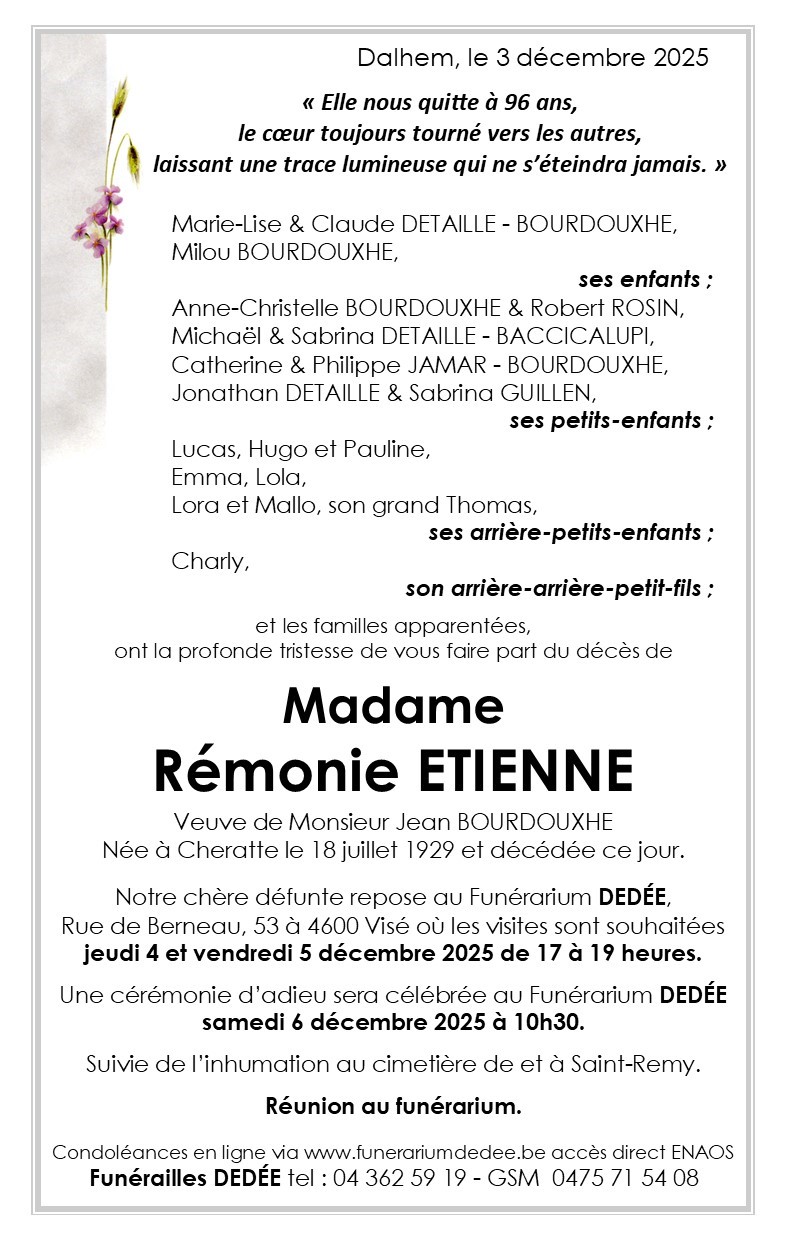 Décédée à Oupeye (4680) le mercredi 3 décembre 2025 à l'âge de 96 ans