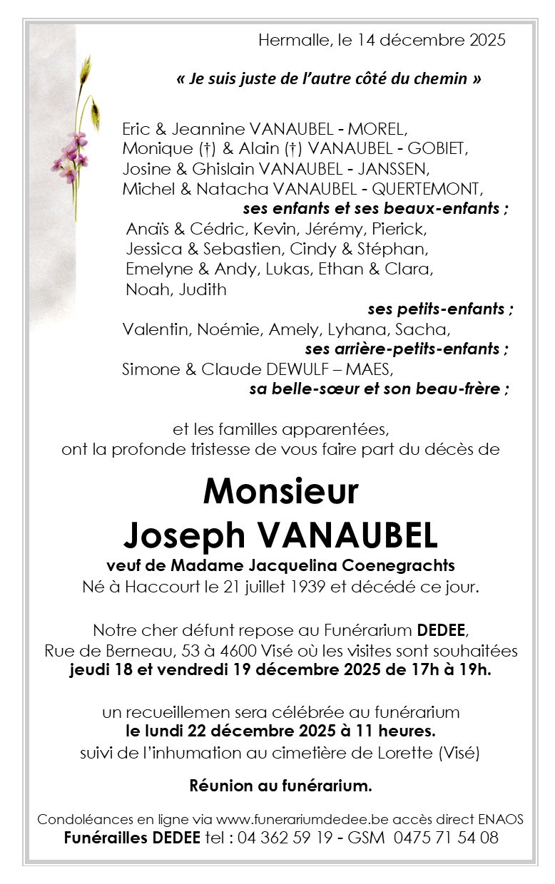Décédé à Hermalle-sous-Argenteau (4681) le dimanche 14 décembre 2025 à l'âge de 86 ans