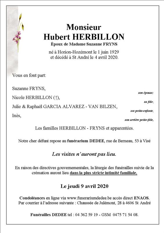 Décédé à Saint-André (Dalhem) (4606) le samedi 4 avril 2020 à l'âge de 90 ans