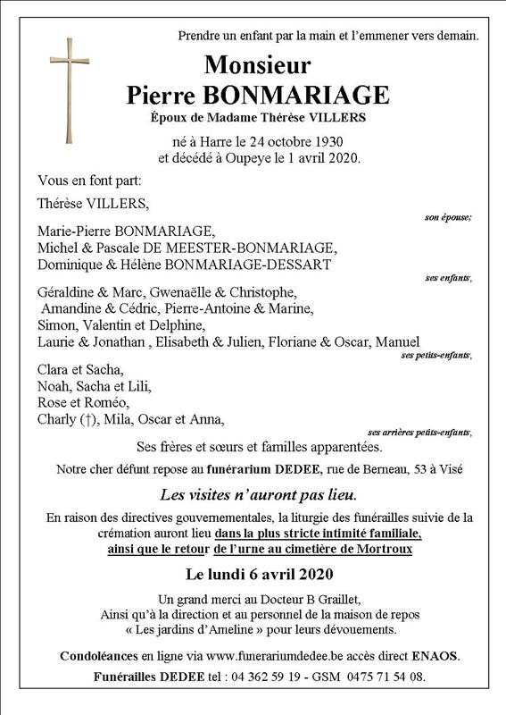 Décédé à Oupeye (4680) le mercredi 1 avril 2020 à l'âge de 89 ans