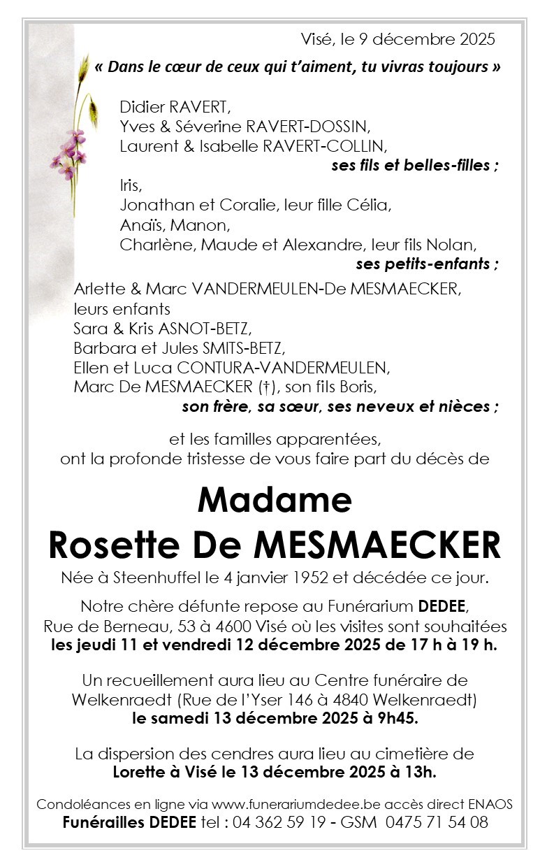 Décédée à Visé (4600) le mardi 9 décembre 2025 à l'âge de 73 ans