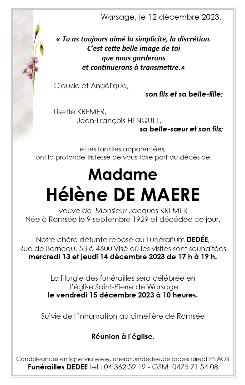 Décédée à Hermalle-sous-Argenteau (4681) le mardi 12 décembre 2023 à l'âge de 94 ans