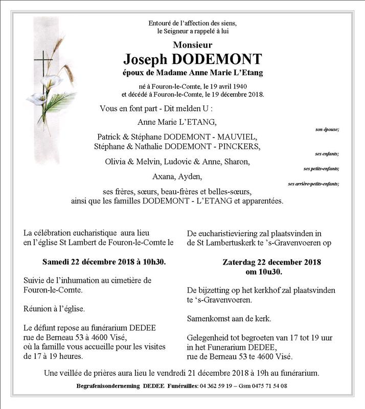 Décédé à 's Gravenvoeren (3798) le mercredi 19 décembre 2018 à l'âge de 78 ans